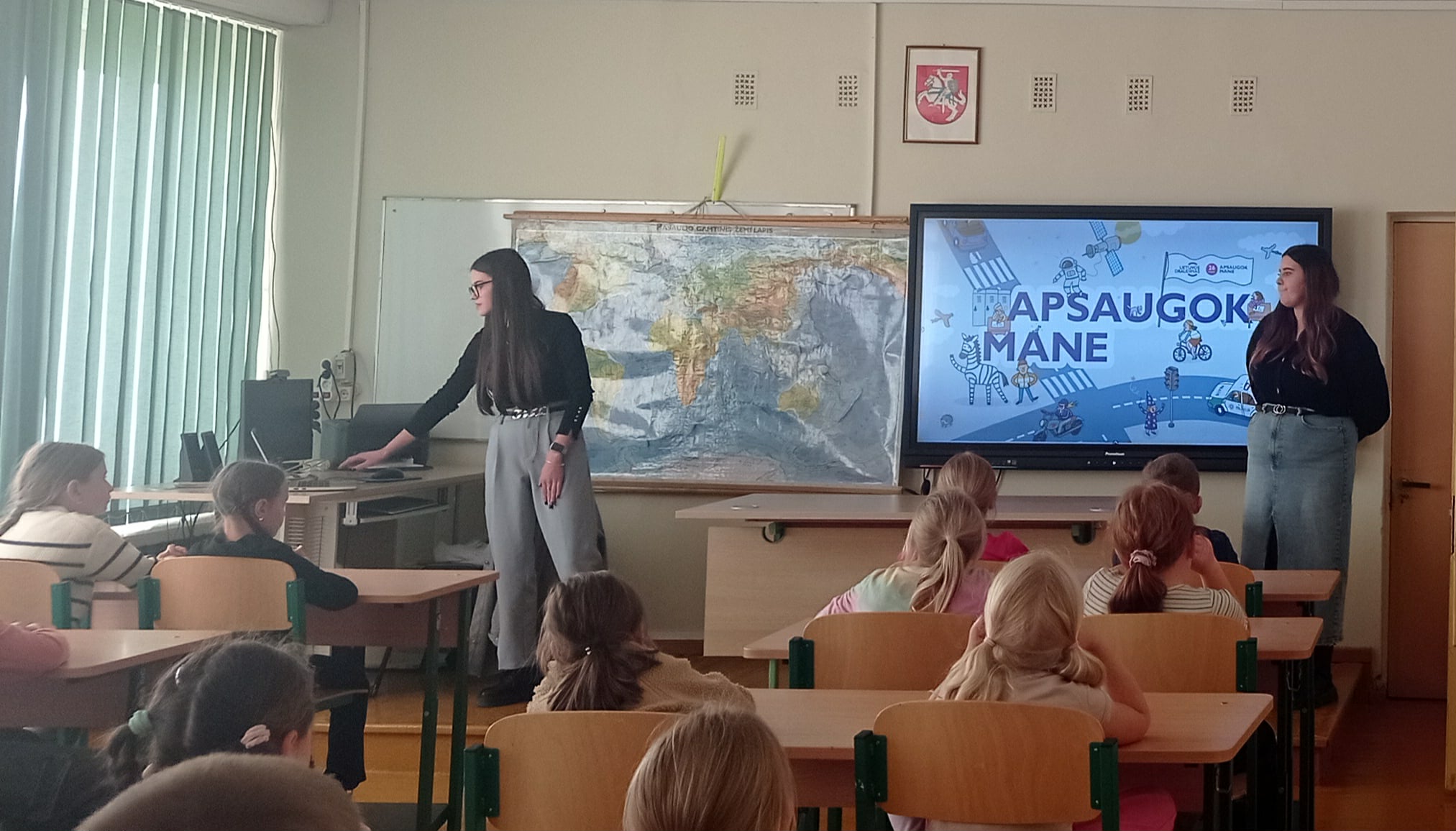 Rugsėjo paskutinį penktadienį mūsų mokyklos pradinių klasių mokiniai buvo vieni iš laimingųjų, kuriuos aplankė „Lietuvos draudimo“ akcijos „Apsaugok mane“ atstovės. Lietuvos Draudimo duomenimis net 40 % visų eismo įvykių patenka į pradinių klasių moksleivių statistiką.