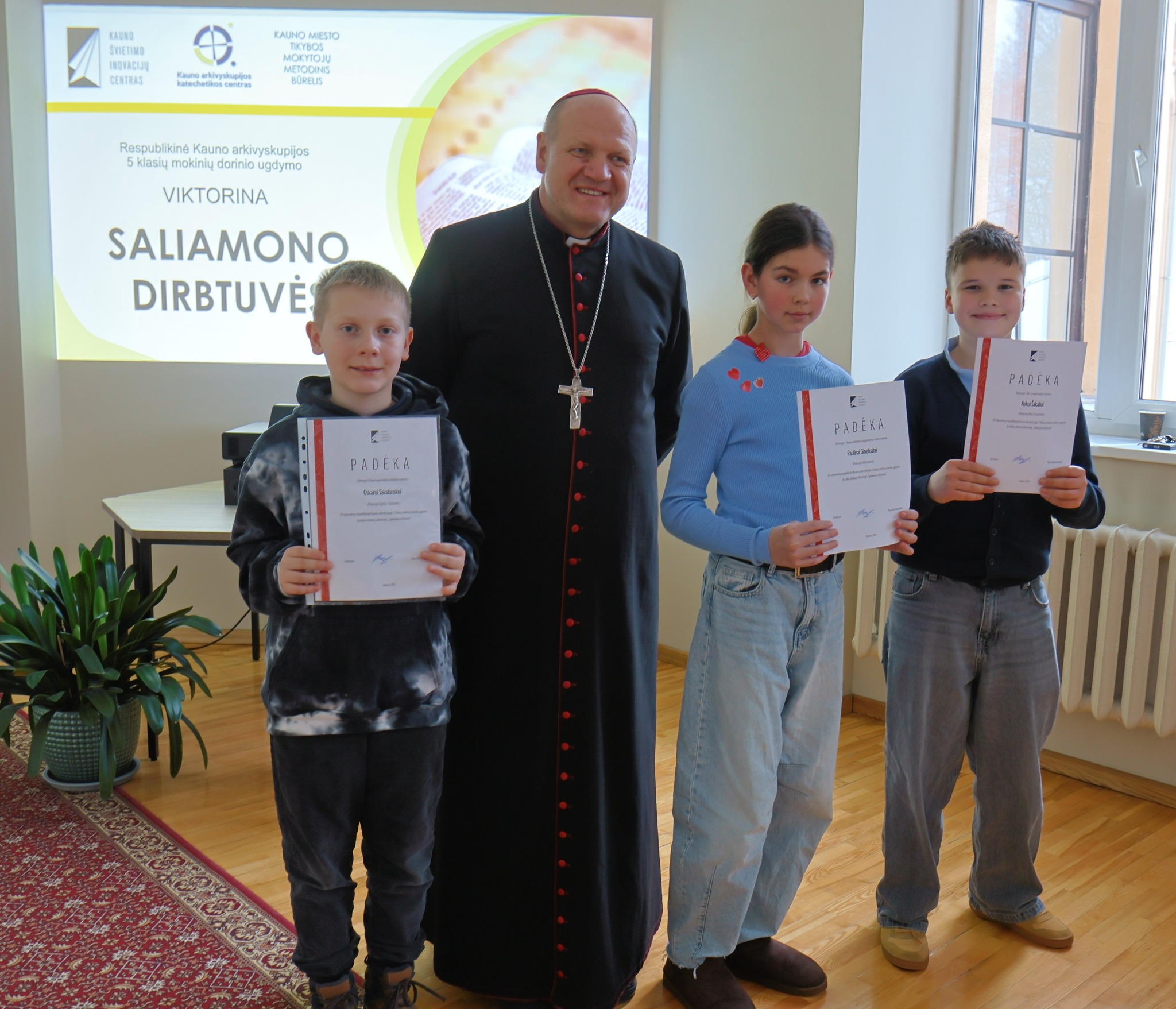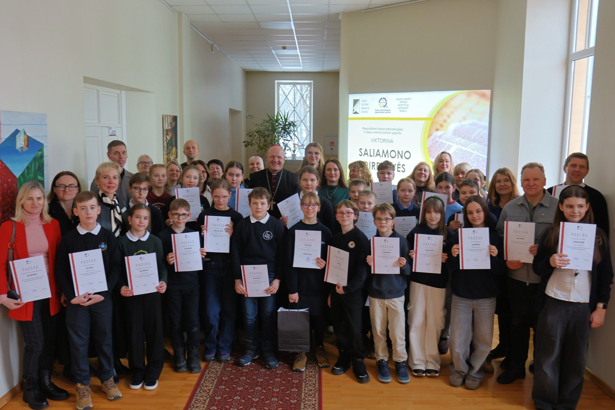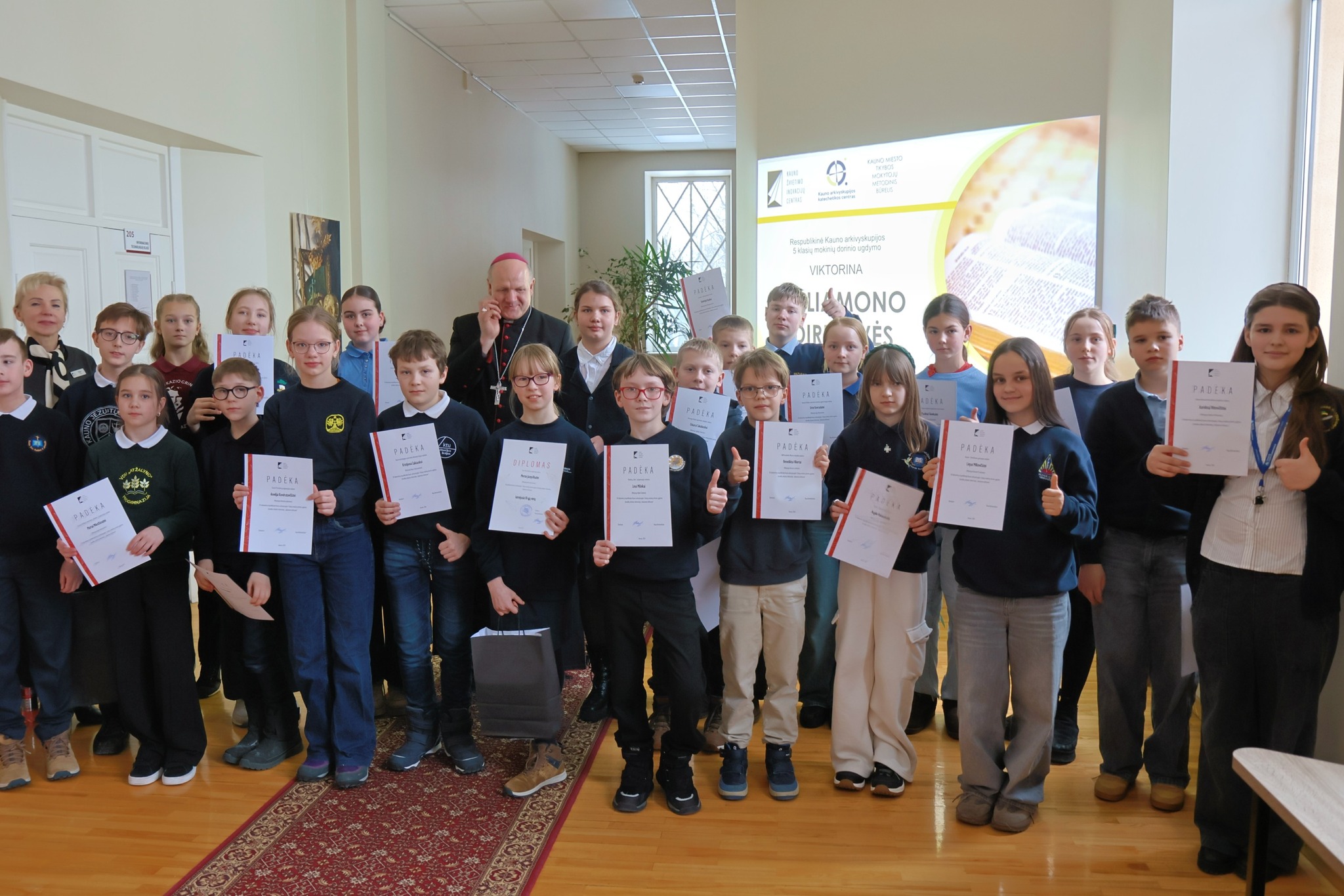 Kauno arkivyskupijos vyskupas Saulius Bužauskas prieš viktoriną ne tik nuoširdžiai bendravo, bet ir suteikė palaiminimą visiems susirinkusiems. Vyskupo padrąsinti mokiniai sklandžiai atliko pateiktas užduotis. Pasibaigus viktorinai visiems dalyviams buvo įteikti padėkos raštai.