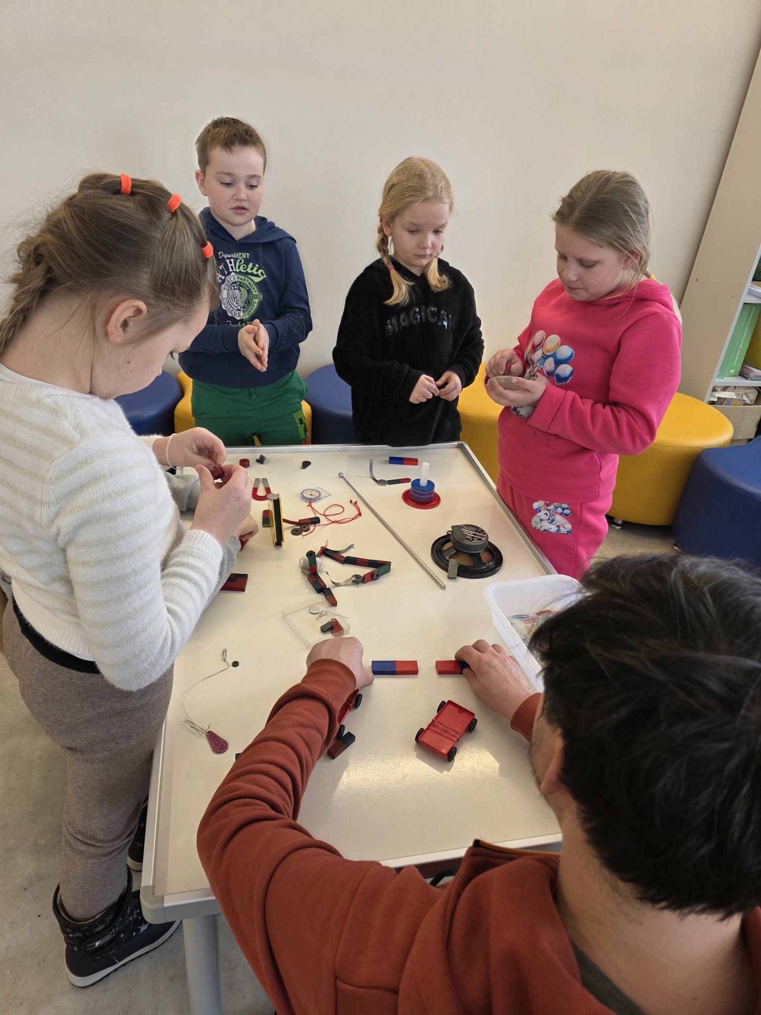 Vasario 27 dieną mūsų mokyklos pradinukai svečiavosi Utenos švietimo centre įsikūrusiame „Rotariuke” ir dalyvavo edukacinėje programoje „Magnetų karalystė”. Edukacinės programos metu mokiniai susipažino su pagrindiniais magnetiniais dėsniais ir sužinojo, kaip magnetai pritaikomi kasdieniame gyvenime bei kūrybinėje veikloje. Vaikai patys kūrė magnetinius pastatus, mokėsi dirbti komandoje ir ieškoti kūrybiškų sprendimų. Mokinukai sužinojo labai svarbią taisyklę – skirtingi magneto poliai traukia vienas kitą. Taip pat išsiaiškino ir patys įsitikino, kad magnetas nelimpa prie kai kurių medžiagų: aliuminio, vario, aukso, sidabro, plastiko. Vaikus nustebino faktas, kad Japonijoje kursuoja traukiniai, kurie „skraido” magnetinių pagalvių pagalba. Taip pat mokiniai sužinojo, kad šalia esant stipriam magnetui kompasas gali rodyti neteisingą kryptį.