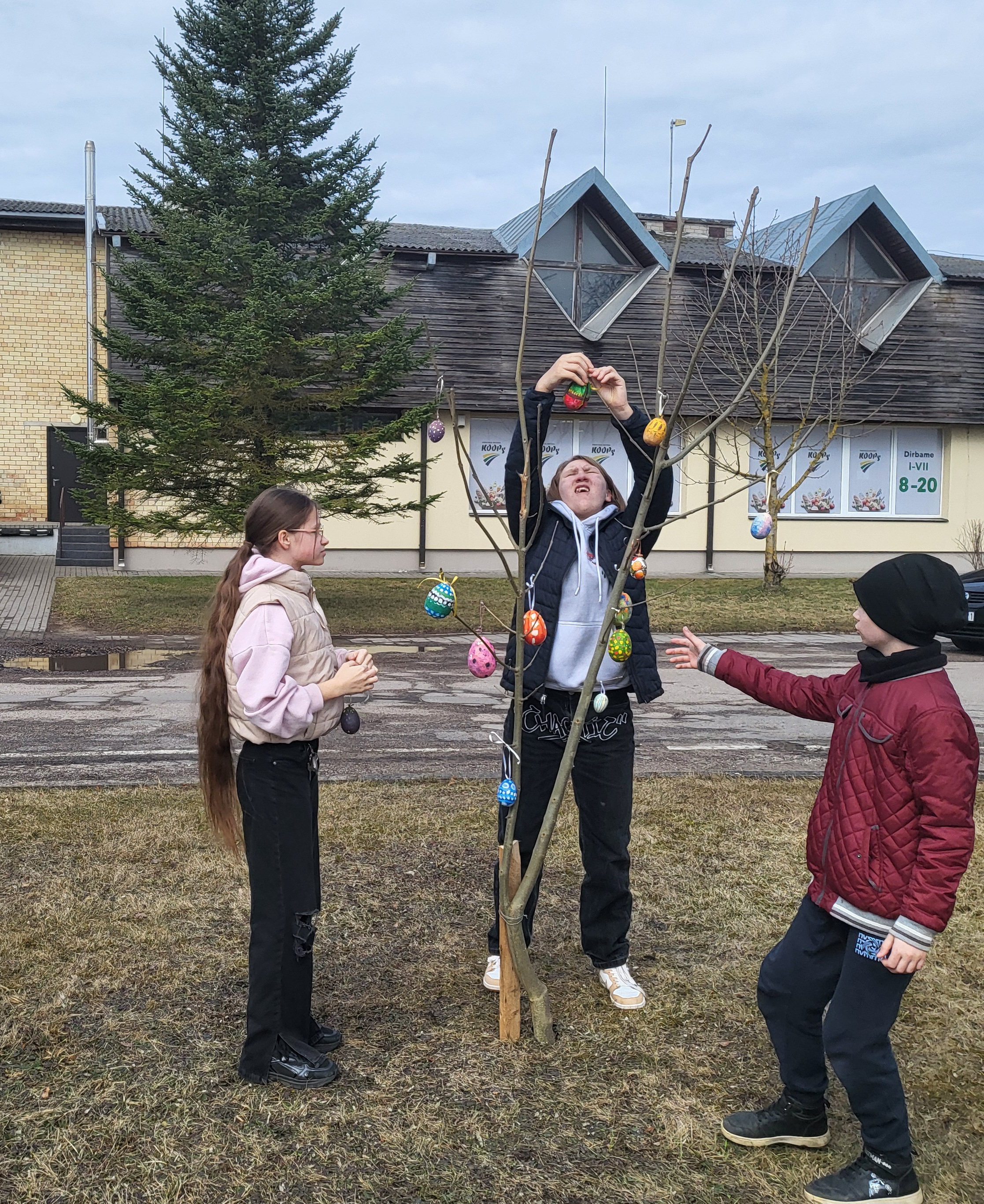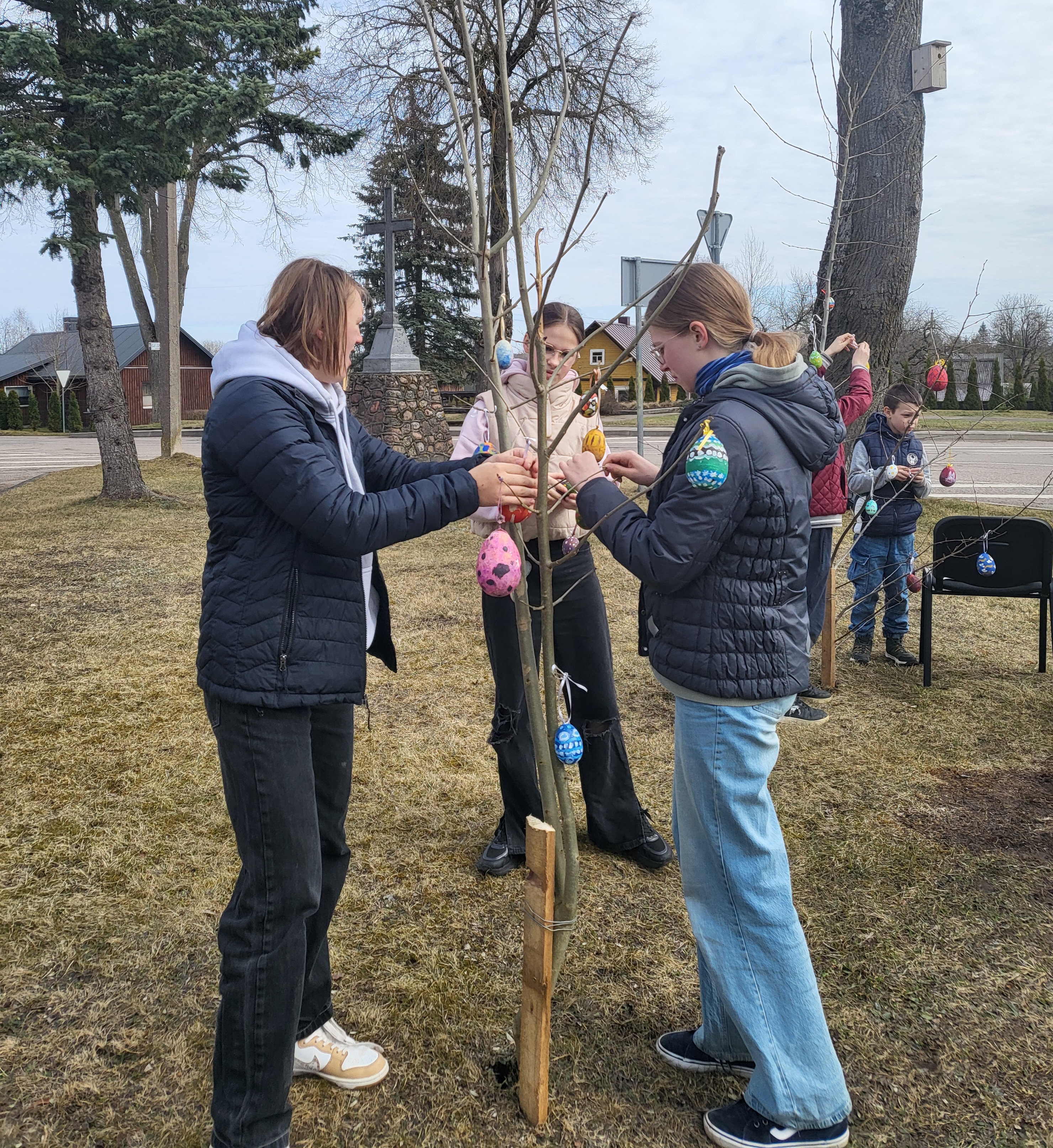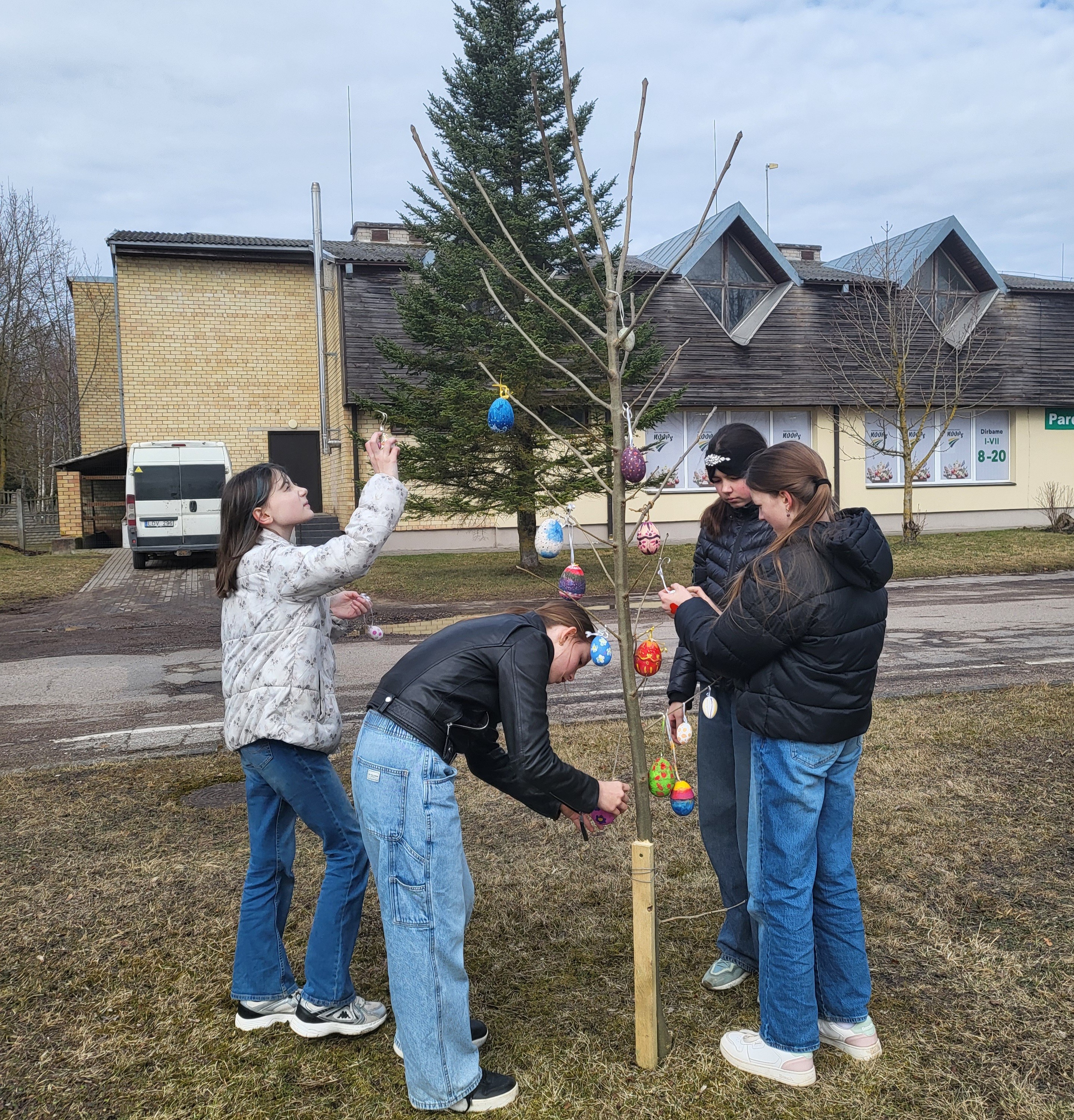 Artėjant šv. Velykoms 5, 6 kl. mokiniai, vadovaujami technologijų mokytojos Valerijos Jurevičienės, dekoravo naujus bei atnaujino ankstesniais metais dekoruotus margučius. Jais miestelio centre mokiniai papuošė tris medelius, kurie papildė šventinėje aikštėje kitas bendruomenės sukurtas dekoracijas.